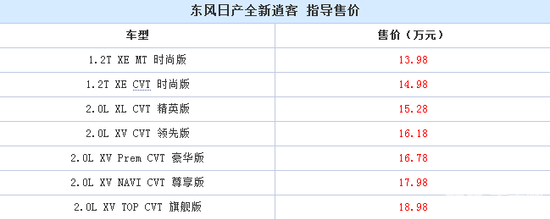 10月16日,全新逍客正式上市,共有7款车型供消费者选择,售价区间为13.98-18.98万,详情见下表: