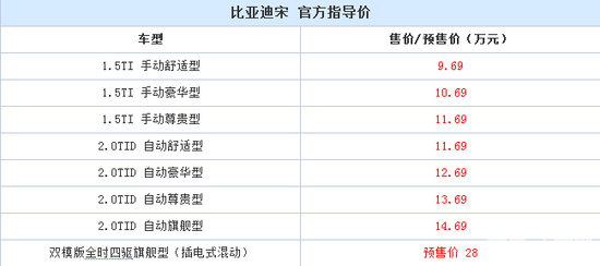 10月12日,比亚迪旗下全新紧凑级SUV车型宋在北京正式上市,新车提供1.5T、2.0T及插电式混合动力系统供消费者选择,其中燃油版车型售价区间为9.69-14.69万,双模混动版预售价为28万。详情见下表:
