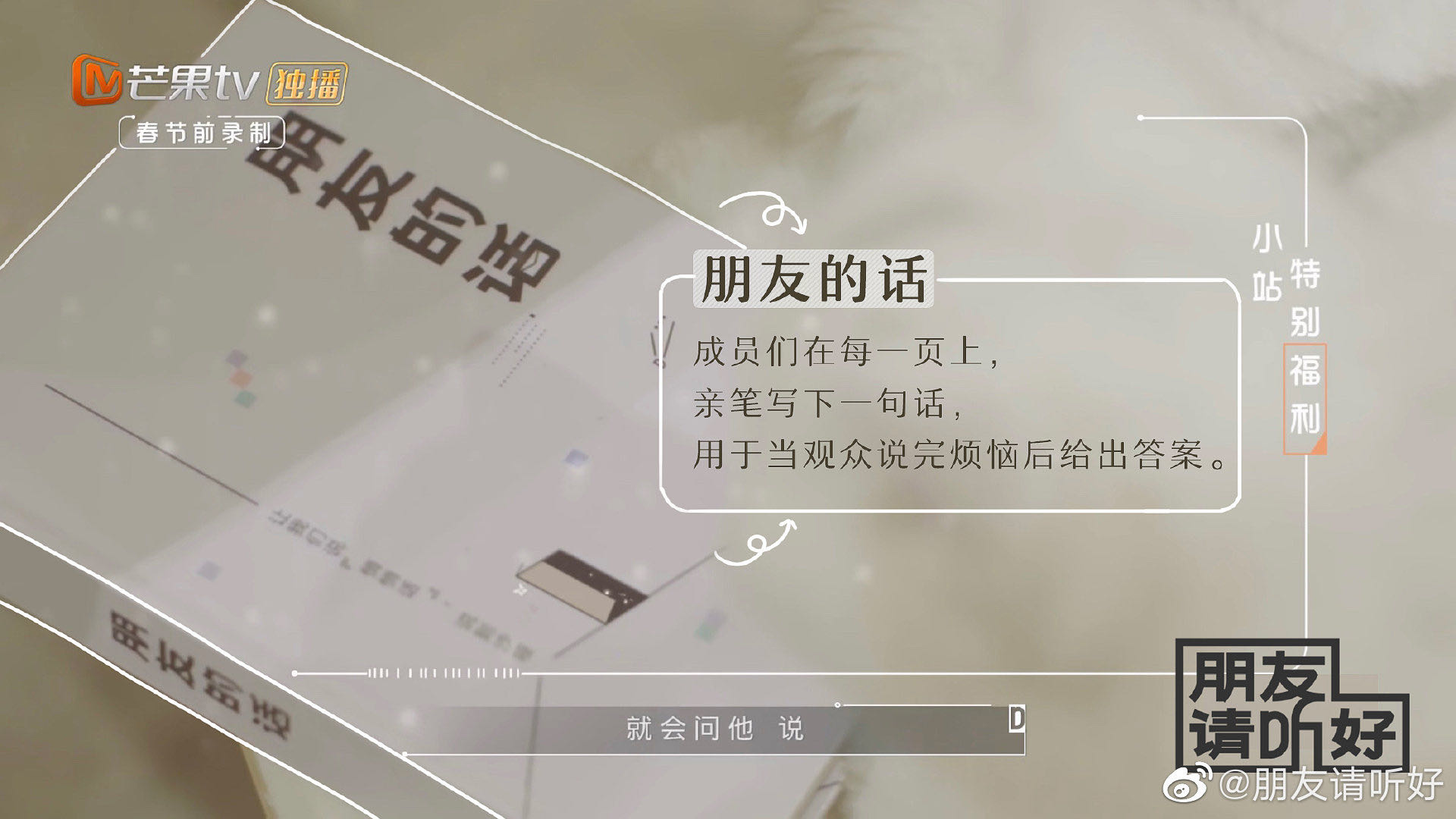 然后另外一部分就是写“朋友的话”。不一定要规定什么时候去写,这个可以随时随地做,我觉得这也是比较珍贵的事情。从第四集之后,我们每一集都会给嘉宾设计一些新玩法。第一是他们可以做到的,第二是对他们来说每一集也能有新的挑战,第三又不会引起焦虑。就按照他们的节奏去走,我觉得这是最舒服的状态。