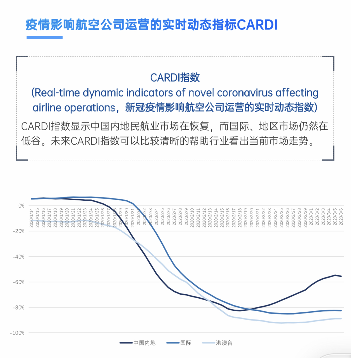 飞友科技提供的数据显示,CARDI(新冠疫情影响航空公司运营的实时动态指标)显示,从2月底开始疫情对于国内航线的影响逐渐减少。
