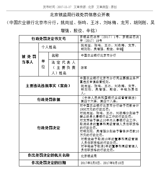 2017年11月17日,北京市银保监局公布了该案的处罚情况,农业银行北京分行被罚1950万,这是当年银监系统开出的最大罚单。