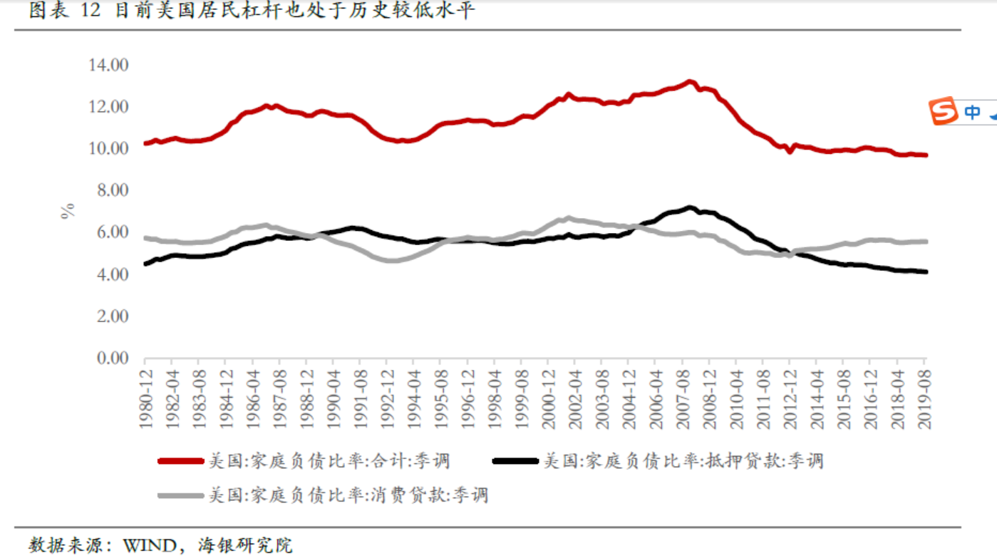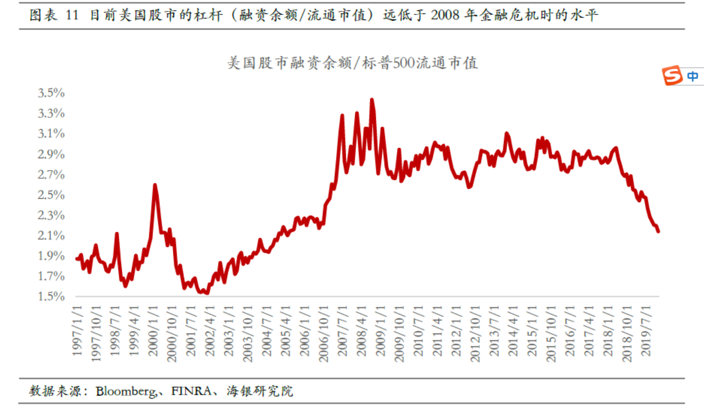 海银财富在研究报告中指出,2008年金融危机爆发前,美国股市、房地产市场的杠杆率非常高。高杠杆率下,一旦预期扭转,资产价格下跌,恐慌和跌幅就会被放大,而且股市和地产的双高杠杆会引发巨大的联动冲击。而目前,美国股市和地产的杠杆均较2008年大幅下降。因此,从债务角度看,近期美国爆发新一轮金融危机的可能性有限。