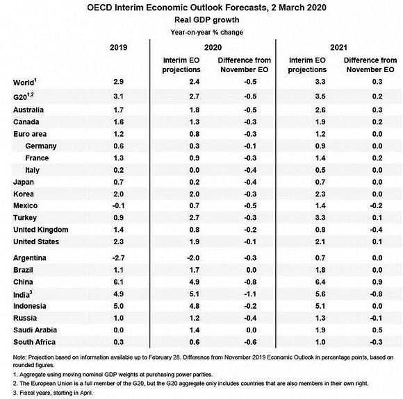 经济合作与发展组织(简称经合组织,OECD)在本月初发布的最新《全球经济展望报告》中警告称,受新冠肺炎影响,即便在最好的情况下,2020年全球经济增速也仅有2.4%左右,如果病毒扩散至整个亚洲、欧洲和北美洲,那么2020年全球经济增速将跌至1.5%。
