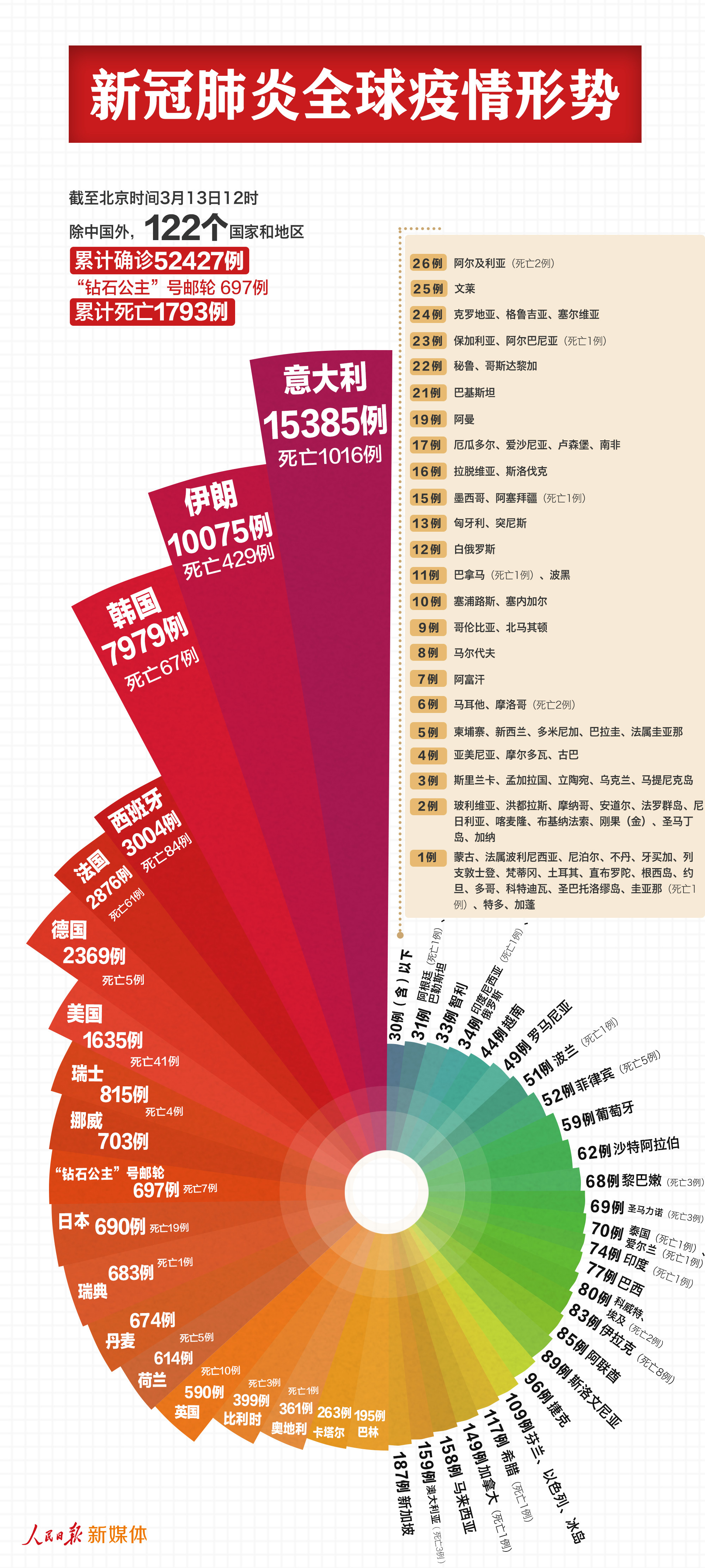 截至北京时间3月13日12时,除中国外,122个国家和地区累计确诊52427例新冠肺炎,“钻石公主”号邮轮697例,累计死亡1793例。