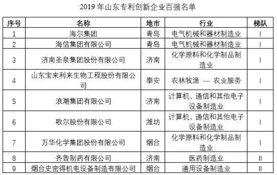 近日,由山东省科学技术情报研究院、青岛科学技术信息研究院研究联合完成的《山东专利创新企业百强(2019)报告》对外发布,同时发布2019年山东专利创新企业百强榜单。