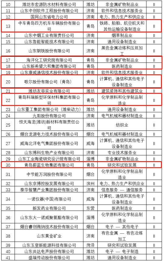 值得注意的是,本次青岛有青岛科瑞新型环保材料集团有限公司、青岛易邦生物工程有限公司、中国船舶重工集团公司第七二五研究所等8家企业新上榜,但2018年在榜单上的中国电子科技集团公司第四十一研究所、青岛琅琊台集团股份有限公司、青岛海洋新材料科技有限公司等11家企业今年却不见了踪影。