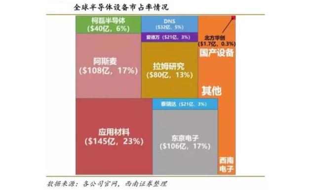 但是2017年应用材料在全球半导体设备市场中的占有率为23%,销售额达到145亿美元。相比之下,2017年北方华创在全球市场中的占有率仅有0.3%,销售额1.7亿美元,还不到前者的零头。