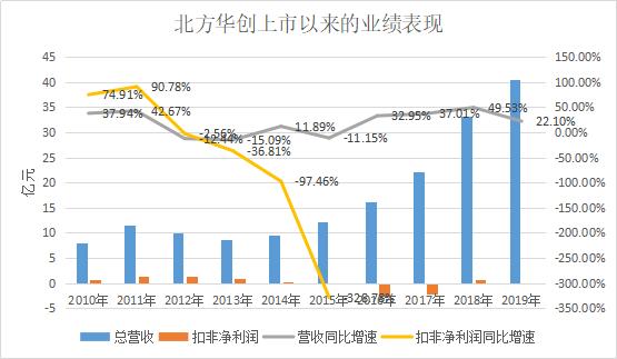 在2010和2011上市的头两年里,北方华创的营收增速分别为37.94%和42.67%,扣非净利润的增速分别高达74.91%和90.78%,发展速度并不算低。但是好景不长,2012年到2015年北方华创的营收表现一直不佳,扣非净利润逐年下滑。