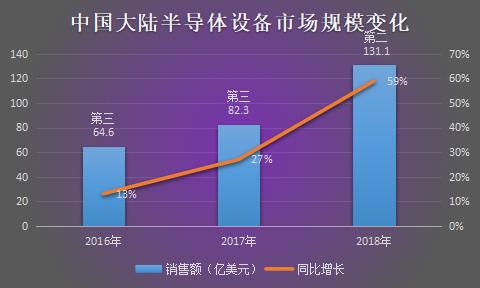 到2018年,中国大陆以59%的增速达到131.1亿美元的成绩,首度跃升为全球第二大半导体设备市场,仅次于韩国。韩国2018年的半导体设备销售额为177.1亿美元,但是同比下降了1%。
