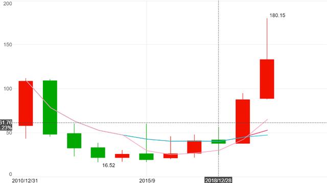 2016年之后北方华创的营收恢复了两位数的增长,但是2016年和2017年扣非净利润分别出现了-2.61亿元和-2.08亿元的巨额亏损,2018年扣非净利润不到1亿元。反映到股价上,就是2016年到2018年这三年北方华创的股价在逐步回升,但是速度很慢。