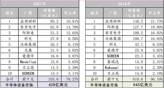 历年来,全球半导体市场在不断向头部集中,到2018年,国际前十大半导体设备巨头在全球市场中的占比超过96%。