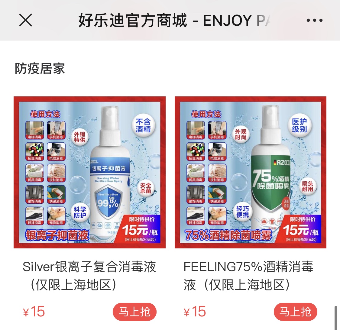 在好乐迪的微店“好乐迪官方商城”里,能找到的商品更是五花八门:有50元抵100元的包厢抵用券;它联合查厘士、久久丫推出的线上企业团餐;标称正在促销的酒水;还有抑菌液、酒精除菌喷雾、免洗洗手凝胶等防疫物资。