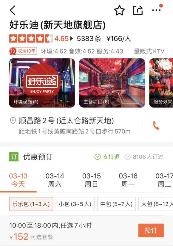 3月13日下午3点,界面新闻联系了好乐迪新天地旗舰店,门店工作人员表示已开始正常营业,目前店内包厢是部分开放,订位的人还不多。店内提供的餐食跟以往一样,价格和品类不变,部分酒水有折扣。大众点评上,这家门店业已开放了预定通道。