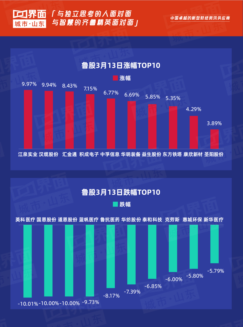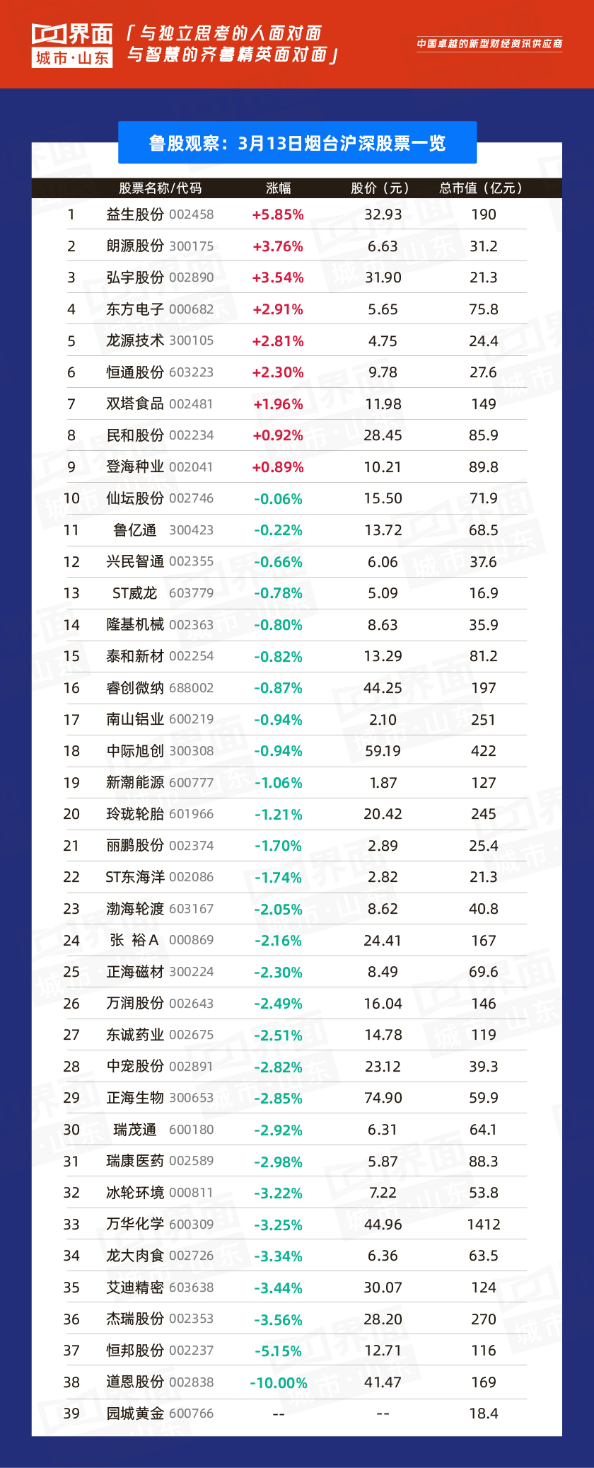 3月13日,山东省内沪深股票有41只个股上涨,163只下跌,6只与上一个交易日收盘价持平;
