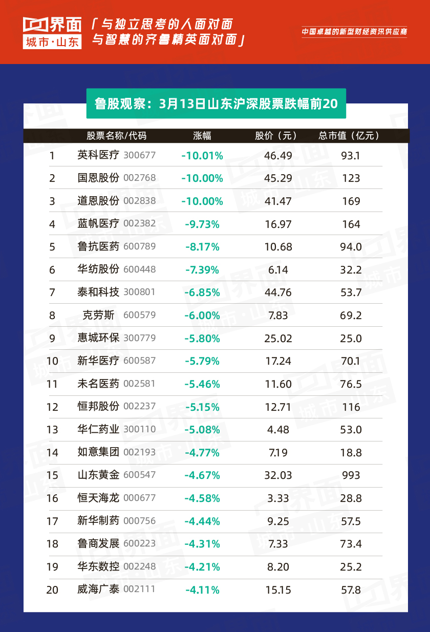 3月13日,山东省内沪深股票有41只个股上涨,163只下跌,6只与上一个交易日收盘价持平。英科医疗涨幅为-10.01%,领跌山东,收于46.49元/股。