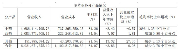 分业务来看,济川药业的中药业务收入同比下滑8.42%,西药业务同比微增1.81%,其他业务增长27.35%。其中,中药业务仍旧是济川药业的营收支柱,营收额占比上市公司总营收67.52%。