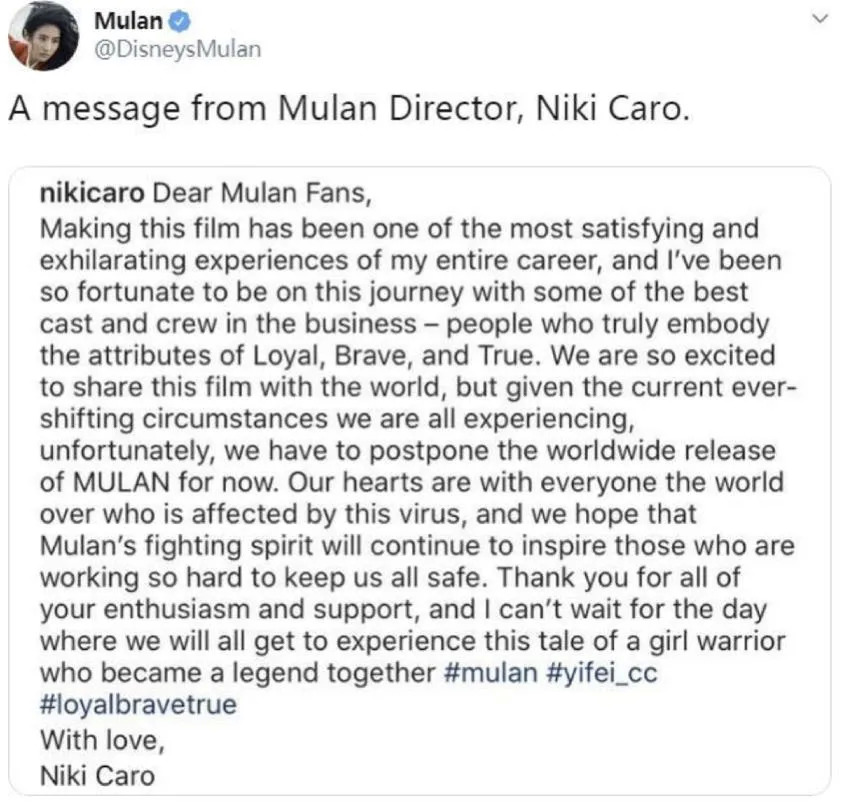 导演妮基·卡罗在推特上写道,考虑到如今不断变化的疫情局势,《花木兰》不得不在全球范围内推迟上映。“我们的心与全世界所有感染了病毒的人同在,同时,我希望木兰的战斗精神可以激励所有在一线奋战抗击疫情的人们,是你们保障了我们的安全。”