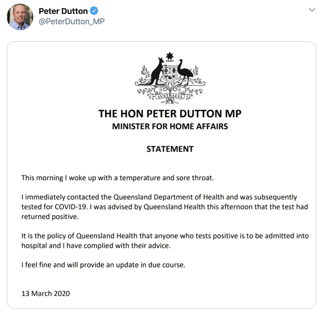 周五(13日),澳大利亚内政部长彼得·达顿(Peter Dutton)在推特上发表声明称,自己已确诊感染新冠病毒。