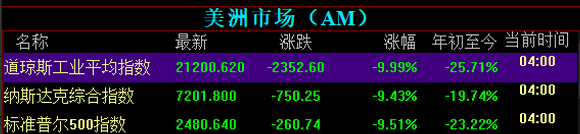 最终,标普500指数收盘下跌9.5%,道琼斯工业平均指数下跌近10%,纳斯达克指数大跌9.43%,三大股指均跌入熊市区域。而就在几周前,这三大股指均创下历史新高。