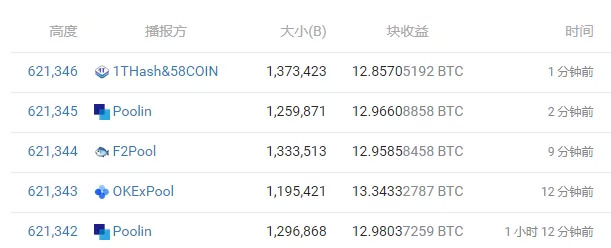 比特币出块也出现了“惊人一幕”。比特币在区块高度621,342由币印矿池完成出块后,整整一小时未出新块,而比特币平均出块时间约10分钟一块。具体原因尚不明确,但矿工集体关机的传言甚嚣尘上。不过1小时后,由OKEx矿池爆块后,在12分钟内接连爆出4个区块。