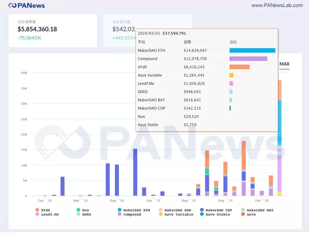 据DeBank数据显示,昨日DeFi产品的当日清算量达到了有史以来的最高峰,共计3759万美元,其中MakerDao的清算量占比最高。Compound清算额达到1207万美元,dYdX清算额为641万美元。
