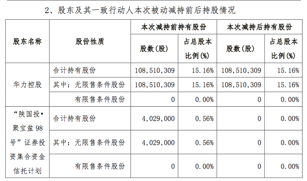 2017年6月,华力控股通过“陕国投•聚宝盆98号”证券投资集合资金信托计划累计增持公司股份1340.29万股,占公司总股本的1.87%。因市场融资环境紧张,信托计划期限届满,根据相关协议,信托计划由资金方对信托财产进行变相处置,导致该信托计划被动减持。