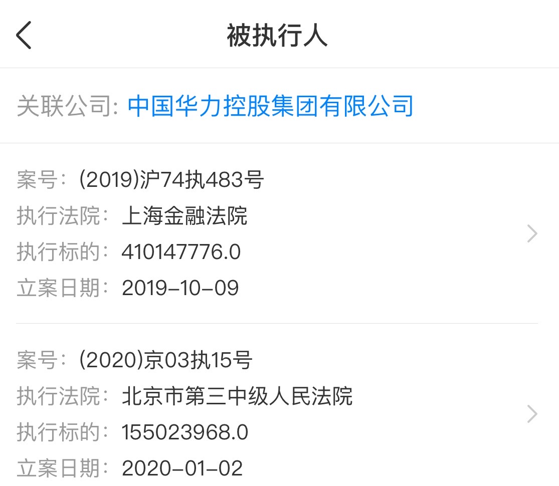 据天眼查信息,华力控股在2019年10月9日被上海金融法院列为失信被执行人,2020年1月2日,被北京市第三中级人民法院列为失信被执行人。
