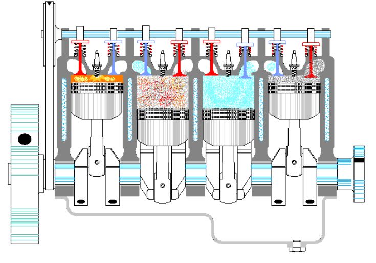 四个缸的工作状态刚好分别对应吸气、压缩、做工和排气四个冲程。这算是一个比较经典的结构,对于四缸发动机来说,曲轴每转过180度就会有一个气缸进行做功,动力输出是相对比较顺畅的,当然,如果是六缸机或者八缸机输出就更顺畅了。