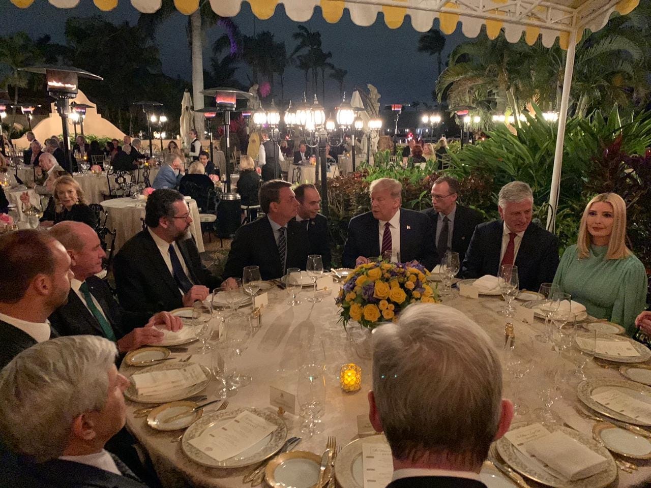 博索纳罗本月7日乘专机出访美国,当天在佛罗里达州海湖庄园与特朗普进行了会面,两人还共进晚餐,当时博索纳罗就坐在特朗普旁边。出席晚宴的还有美国副总统彭斯、特朗普的女儿伊万卡和女婿库什纳。