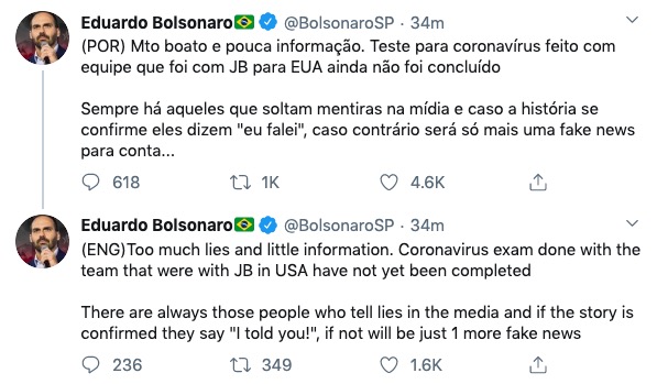他的儿子爱德华多(Eduardo Bolsonaro)在推特上表示,其父的检测过程还未完成,并谴责许多人在向媒体散布谣言。爱德华多在接受美国福克斯新闻网采访时解释称,他们正进行第二轮检测,结果预计很快正式公布。