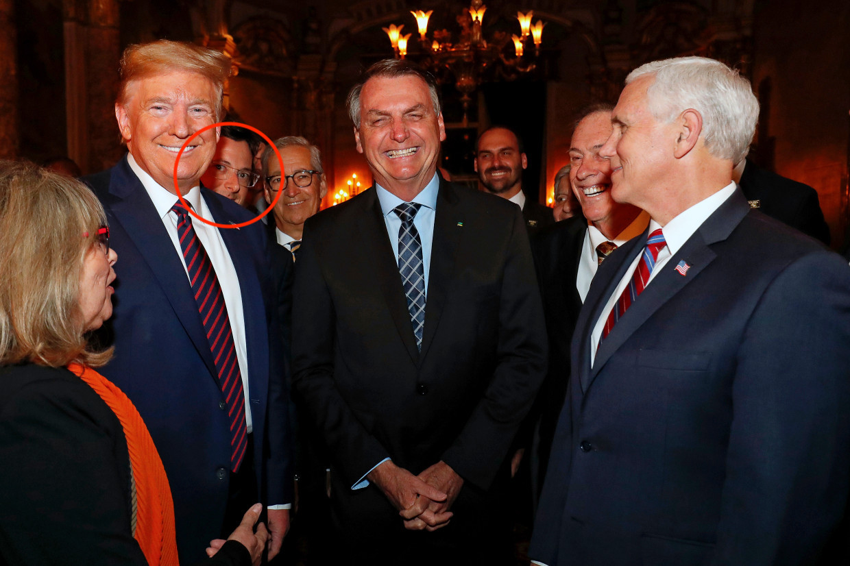 当时特朗普与博索纳罗吃晚餐时是挨着坐的,沃恩加藤的身影似乎未出现在官方发布的现场照中。白宫曾发声明称,特朗普和彭斯与沃恩加藤几乎没有交流。但从沃恩加藤在社交媒体上传的合影中可以看到,当晚他就站在特朗普的身边,同时在场的还有彭斯。