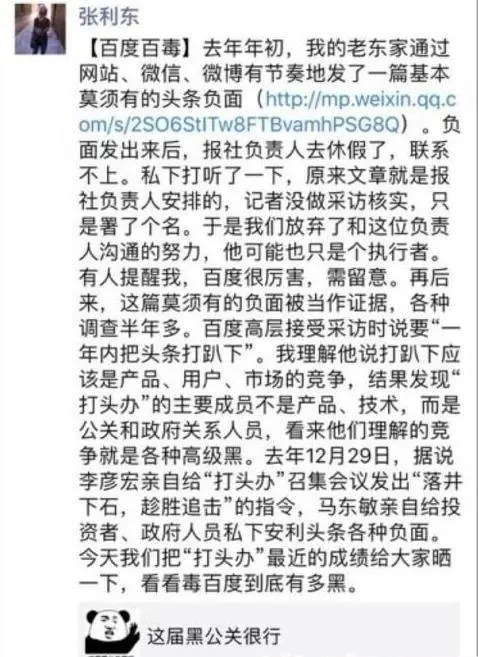 2018年,今日头条和百度从口水战升级为诉讼战,今日头条宣布起诉百度不正当竞争。张利东和百度赵添公开加入战局,张利东直接点名百度创始人李彦宏及其夫人马东敏发指令“打头条”和“黑头条”。