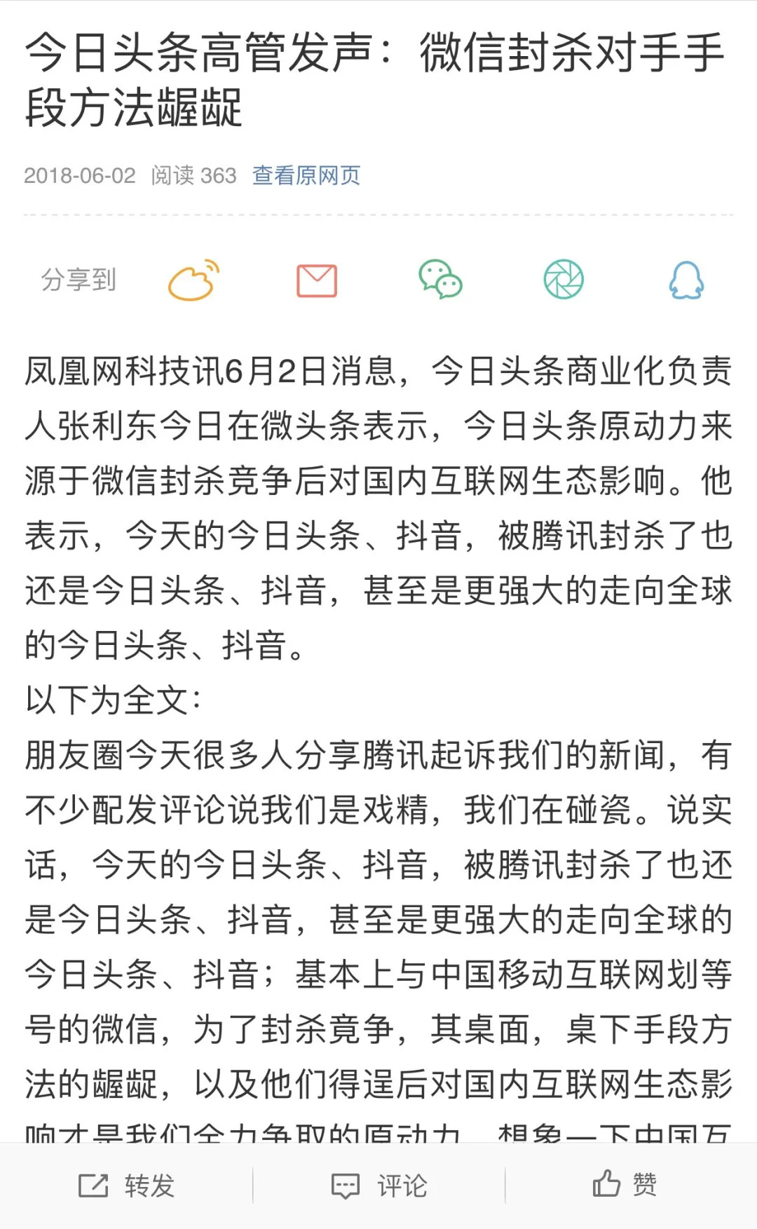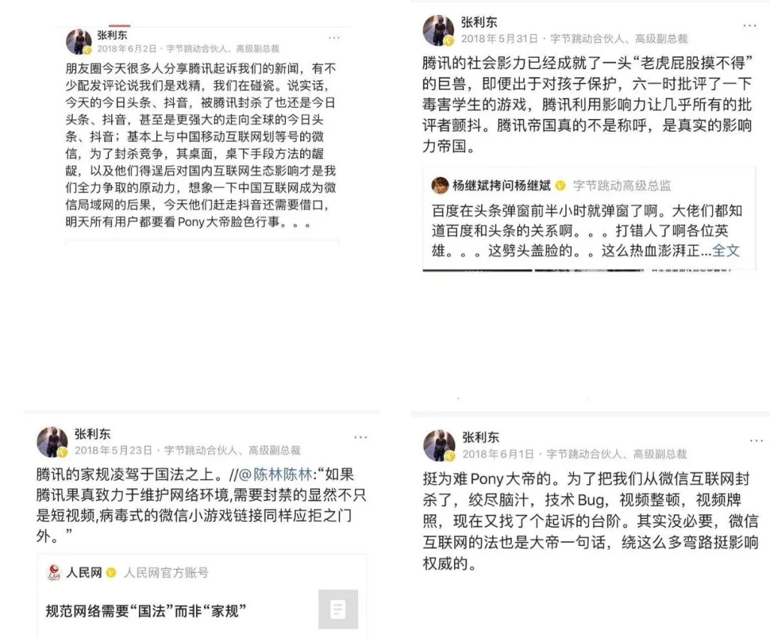 2018年6月,张利东在微头条上表示:“今天的今日头条、抖音被腾讯封杀了还是今日头条、抖音……为了封杀竞争,其在桌面、桌下手段方法的龌龊,以及他们得逞后对国内互联网生态的影响才是我们全力争取的原动力。”