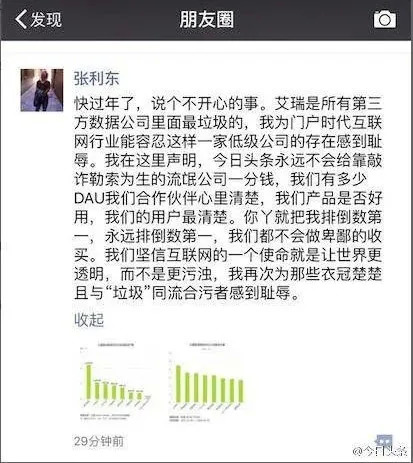 随后张利东也发朋友圈称:“艾瑞是所有第三方数据公司里面最垃圾的,我为门户时代互联网行业能容忍这样一家低级公司的存在感到耻辱”。