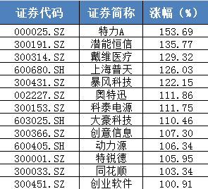 除以上涨幅居前的上市公司个股外,受充电桩概念带动的上海普天(600680.SH)、互联网概念股暴风科技(300431.SZ)等涨幅都均在120%以上。