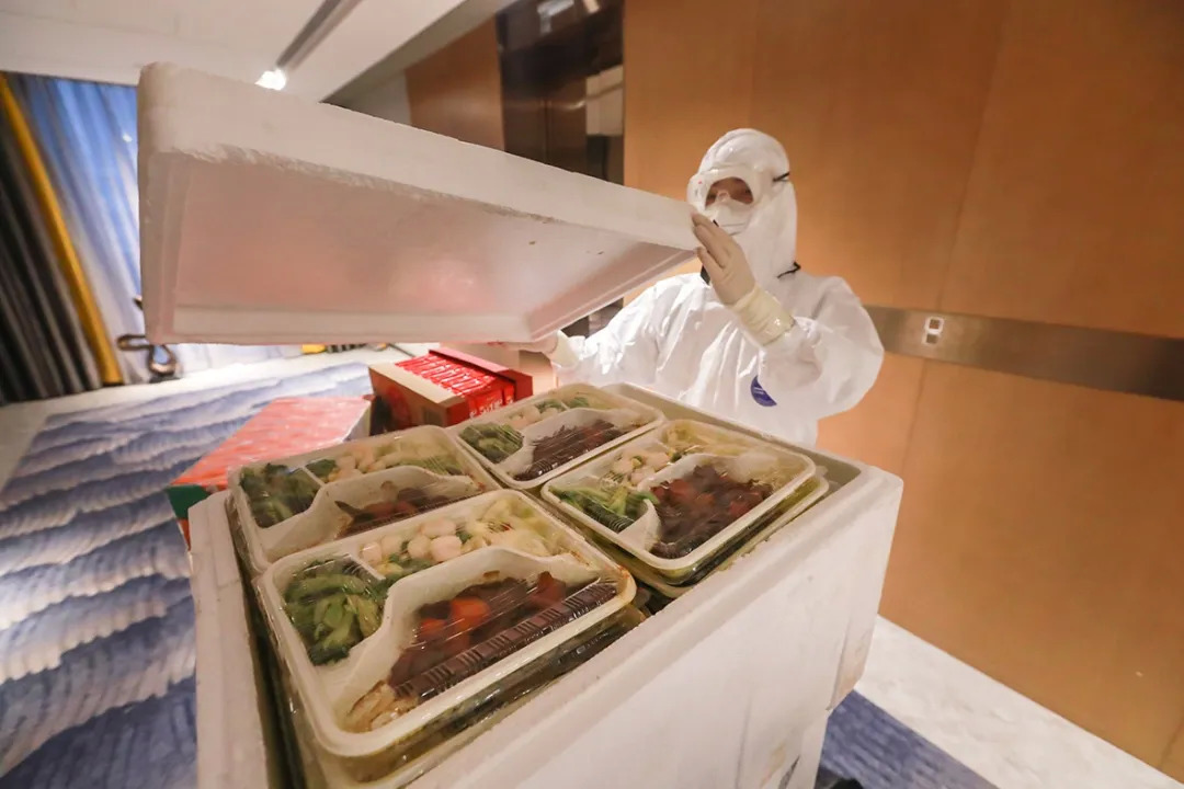 “6楼xx房需要赶紧送快递过去!”接到“前台”的指令后,来自联明保安公司的“快递小哥”张亚辉立马行动起来,他推着满满一推车的快递上了电梯,优先为“催单”的隔离人员送上了快递。
