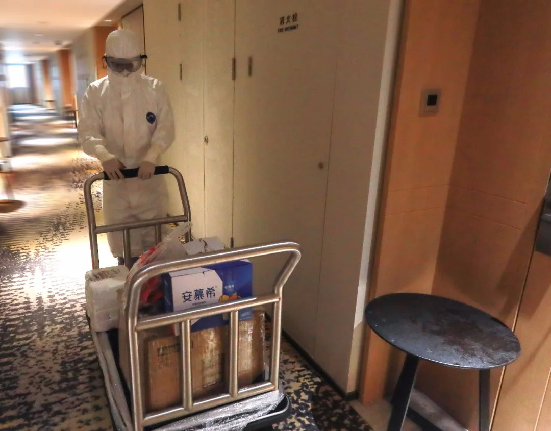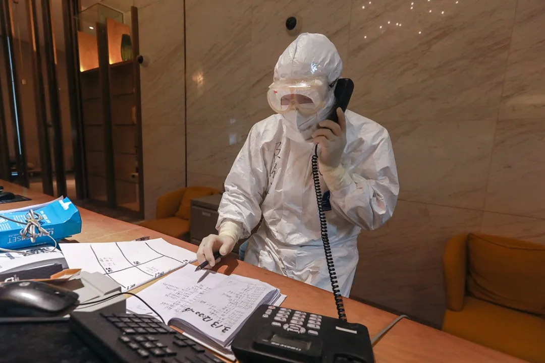 这是一个度假酒店,自动感应玻璃门两侧的围廊上,挂满了星星点点的灯带,伴随着轻盈的音乐,在微风中摇曳。“120马上就到!”穿着白色防护服的工作人员打破了宁静。原来,这个酒店临时“变身”为集中隔离点了。
