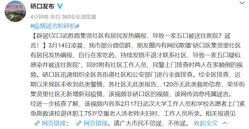 硚口发布微博今日下午发布,3月14日凌晨,武汉市部分微信群、朋友圈内有网民散播“硚口区集贤里社区有居民发热瞒报,自行在家吃药,持续发烧不退才联系社区,导致一家五口疑似感染并被送往医院”,同时附有社区工作人员、民警上门排查时两人在家躺倒的视频。