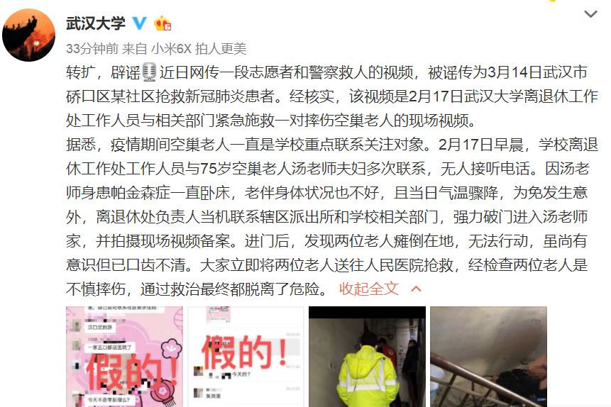 硚口发布微博介绍,经进一步核查了解,经进一步核查了解,该视频内容系2月17日武汉大学工作人员和学校志愿者上门紧急施救该校退休职工75岁空巢老人汤老师夫妇时,工作人员所录。
