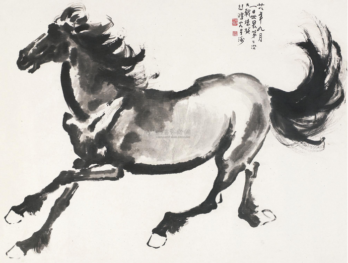 在这将近百年的历史阶段中,中国画坛可谓风云际会、群星璀璨,产生了多位划时代的艺术巨匠,如人们比较熟悉的齐白石、徐悲鸿、黄宾虹、吴昌硕,再到后来的李可染、李苦禅、王雪涛等。他们所取得的艺术成就汇聚在一起,足以与历史上任何巅峰时期比肩。可以毫不夸张地说,上世纪100年必将成为中国美术史上最辉煌的一个时期。这就是中国近现代书画“抗衰”的第一个原因:中国近现代美术大师们的艺术成就极高。