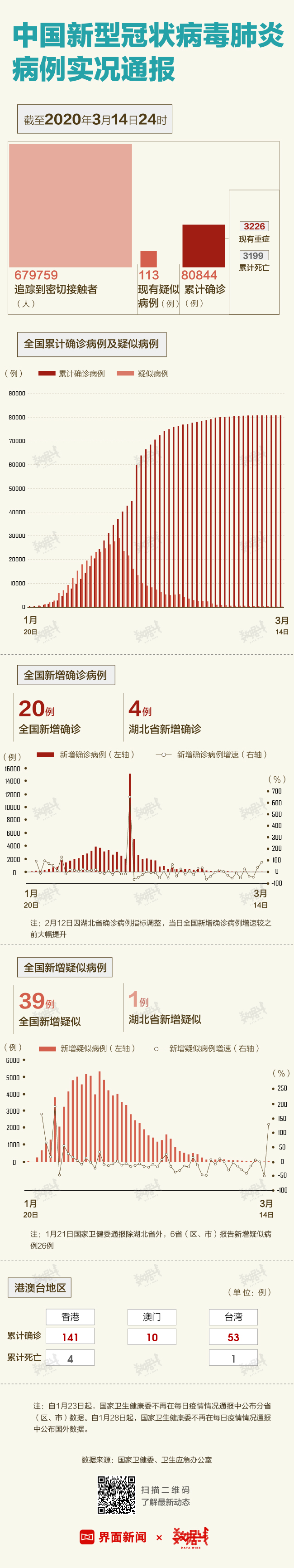 据国家卫健委数据,截至3月14日24时,据31个省(自治区、直辖市)和新疆生产建设兵团报告,现有确诊病例10734例(其中重症病例3226例),累计报告确诊病例80844例,累计报告境外输入确诊病例111例。