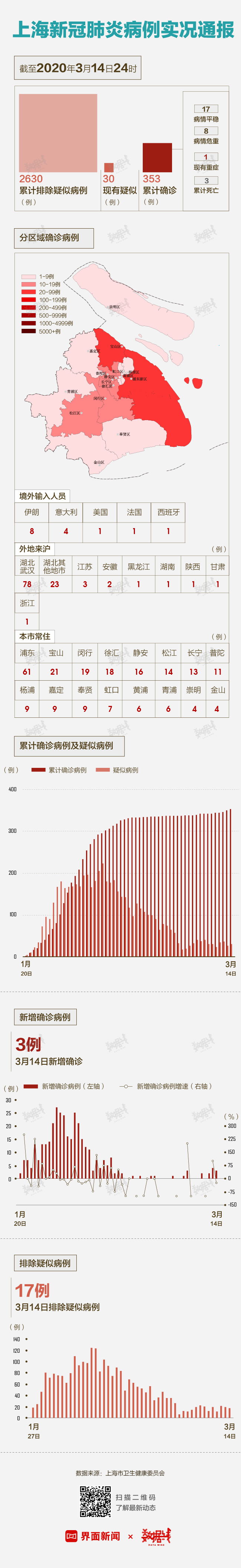 据上海卫健委数据,截至3月14日24时,上海市已累计发现确诊病例353例。尚有30例疑似病例正在排查中,其中21例是通过联防联控机制发现的境外输入型疑似病例。