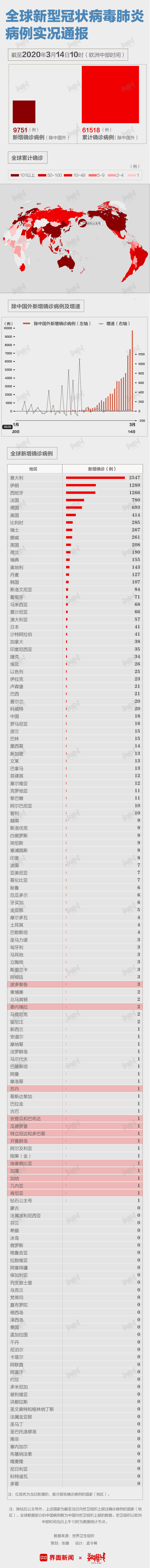 除中国外,全球135个国家及地区累计报告确诊病例61518例,新增确诊9751例,累计死亡2199例。