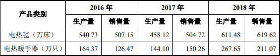 彩虹电器2016~2018年电热毯生产数量,数据来源:招股说明书
