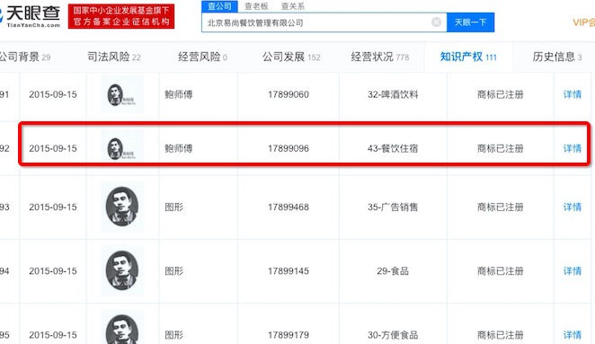 对于已有商标,易尚餐饮还通过转让方式获得,在其与鲍师傅商标持有人北京鲍才胜餐饮管理公司的多起诉讼案件中,提及一个具有争议的17899096号注册商标(鲍海兵头像图),就是易尚餐饮从自然人鲍海兵处购买,2017年获得转让通过。
