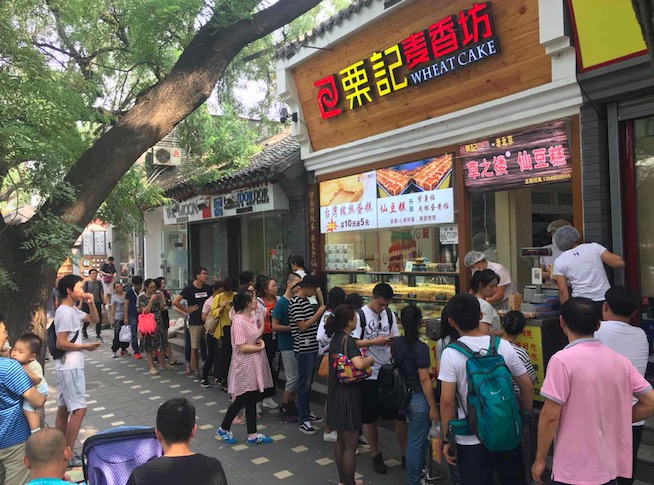 王玉在接受界面新闻的采访中表示,他和妻子栗璐燕2015年从鞍山来北京创业,以栗璐燕的姓氏开设了“栗记”麦香坊仙豆糕门店。曾经在南四环大红门开店受挫后,调整至鼓楼东大街附近的南锣鼓巷开店,直到2016年底才小有名气,到2017年已经成为南锣知名网红美食了。