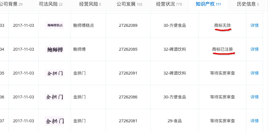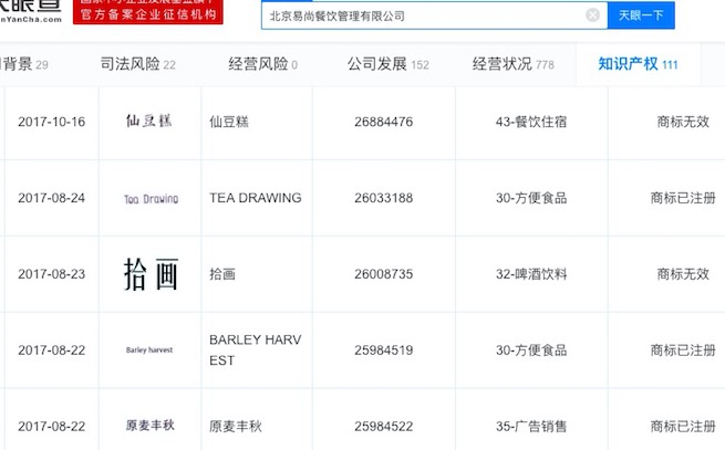 除了鲍师傅商标,易尚餐饮在2017年还对乐乐茶、金拱门、脏脏包、原麦丰收、爸爸带甜心等一系列商标和图形申请注册,目前注册详情中显示商标无效或等待实质审查。