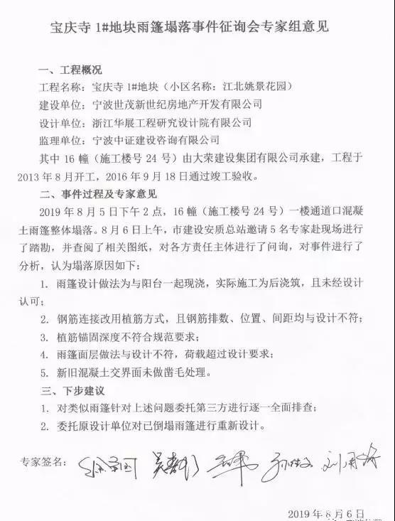 该事件发生后,宁波市住建部门立即会同属地住建部门到现场踏勘查看,当晚就此进行了研究分析,确定后续工作方案。8月6日上午,对该工程参建各方主体进行了约谈问询,由市建设安质总站委托我市土木学会、设计和施工等5位知名结构安全专家组成专家组查阅设计图纸和现场踏勘调查,专家组认为雨篷塌落主要原因是: