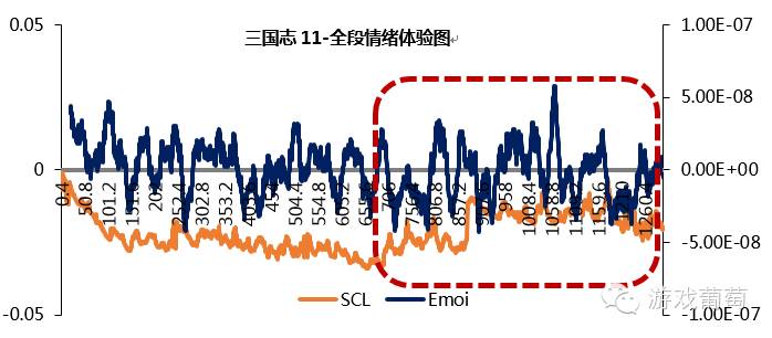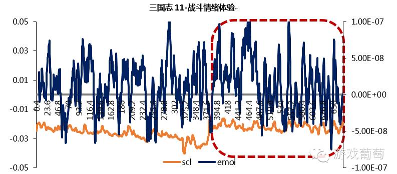 由下图可知,玩家在游戏过程中的情绪波动较大。在内容多为内政系统的前期,玩家的情绪较为轻松,思考水平与决策水平保持稳定;中期加入战斗内容后,玩家的紧张感开始上升,思考和决策水平显著上升,情绪起伏增大,并产生了心流体验。