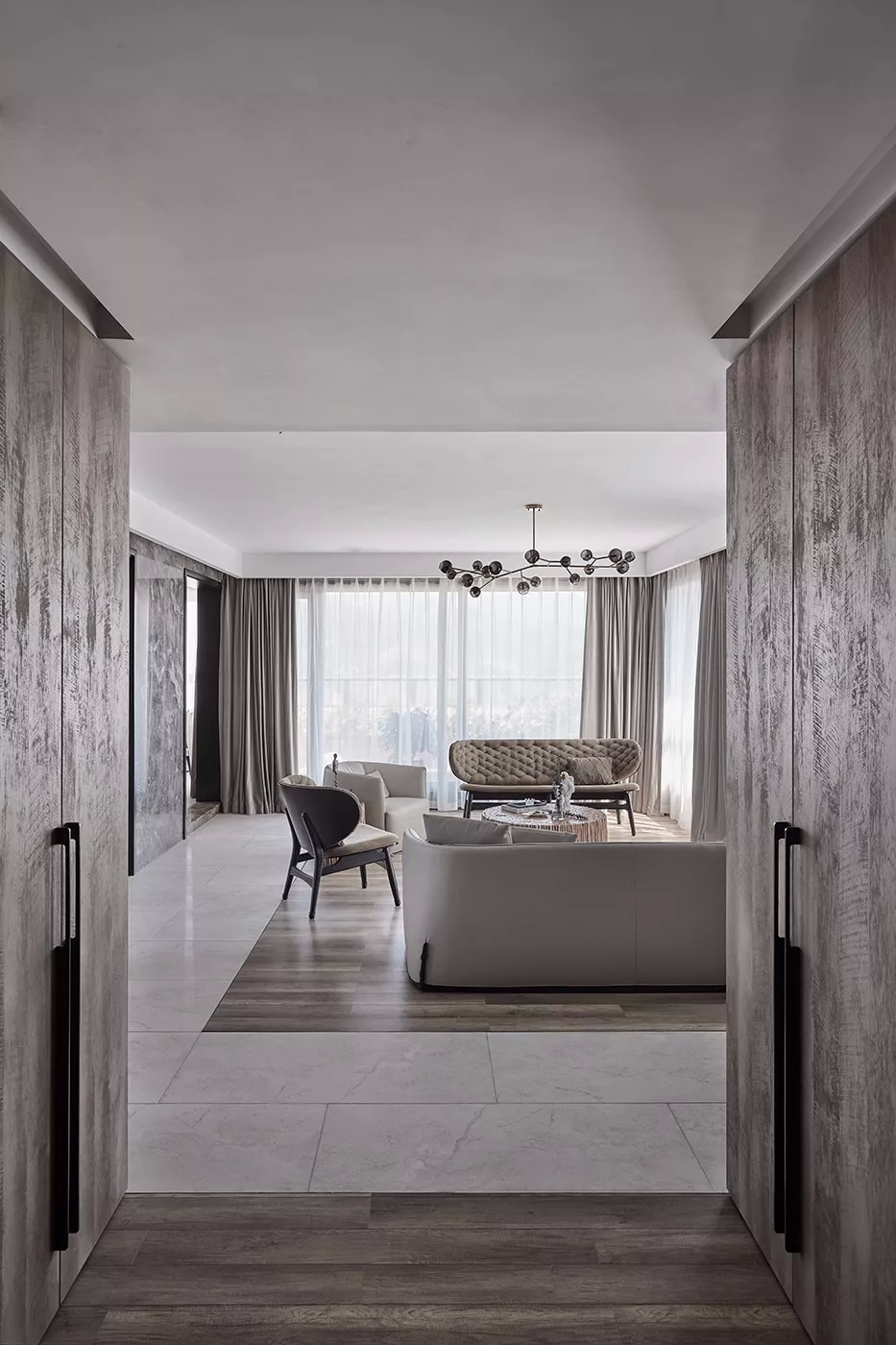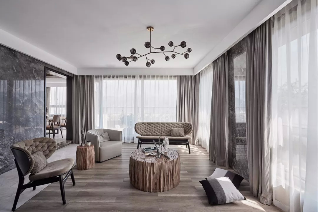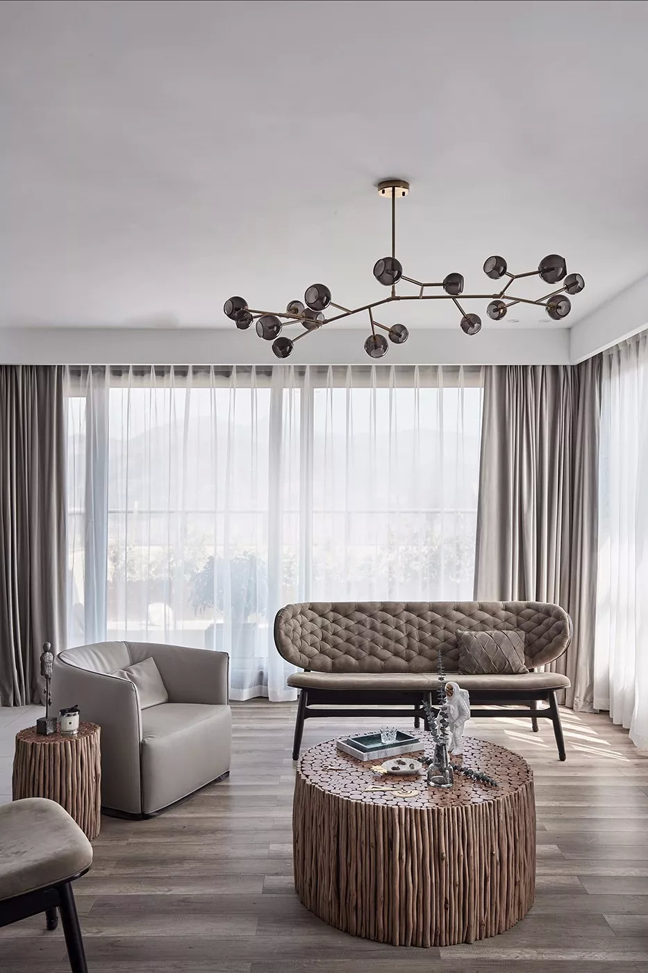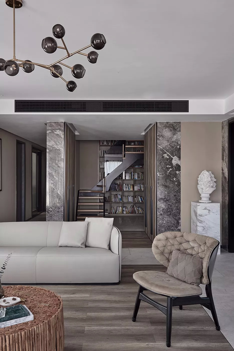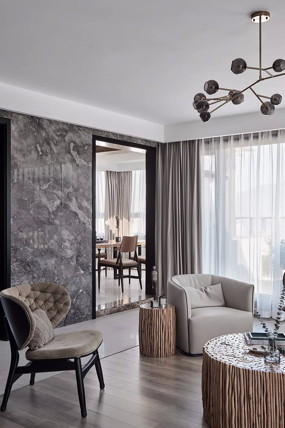 客厅的格局以简约黑白灰为主,冷色穿插,做旧的木桩家具,与地板相呼应。加上充满现代感的灯具点缀,整个空间高冷又不失温馨。简约、自然,没有繁复的装饰,通过大理石优美的纹理和细腻的饰面让空间变得更加精致和有层次感。而实木的融入,让大理石多了几分朴素温暖的韵味,两种材质的完美融合,将功能与美学转化为精致的细节,赋予其刚柔并济的空间氛围。
